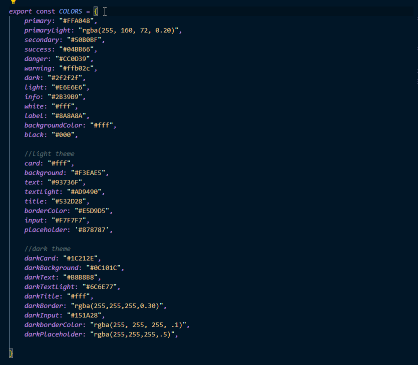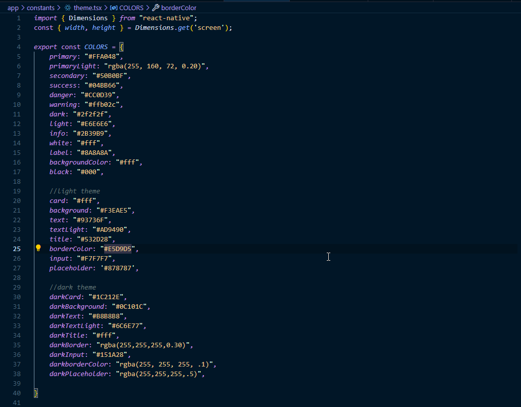 You can change the theme prop dynamically and all the components will automatically update to reflect the new theme. Open file ./app/constants/theme.js
