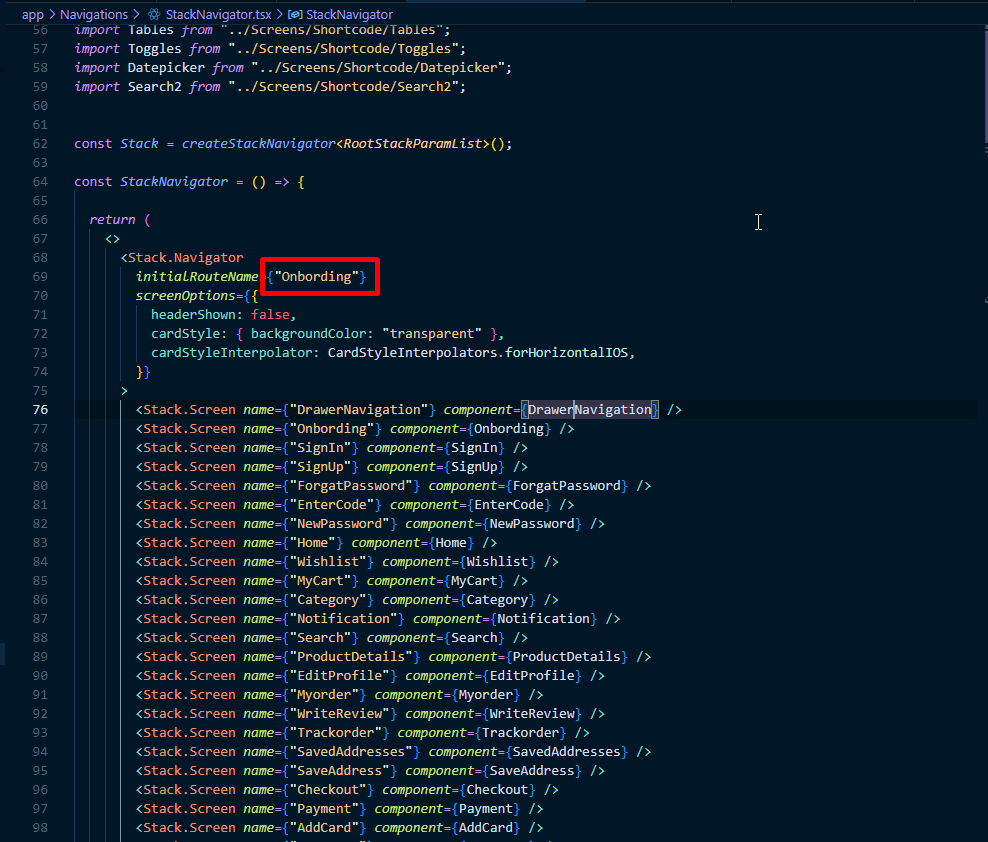 Then navigation has defined in ./app/Navigations/StackNavigator.js will link with screens locate in folder ./app/screens/..